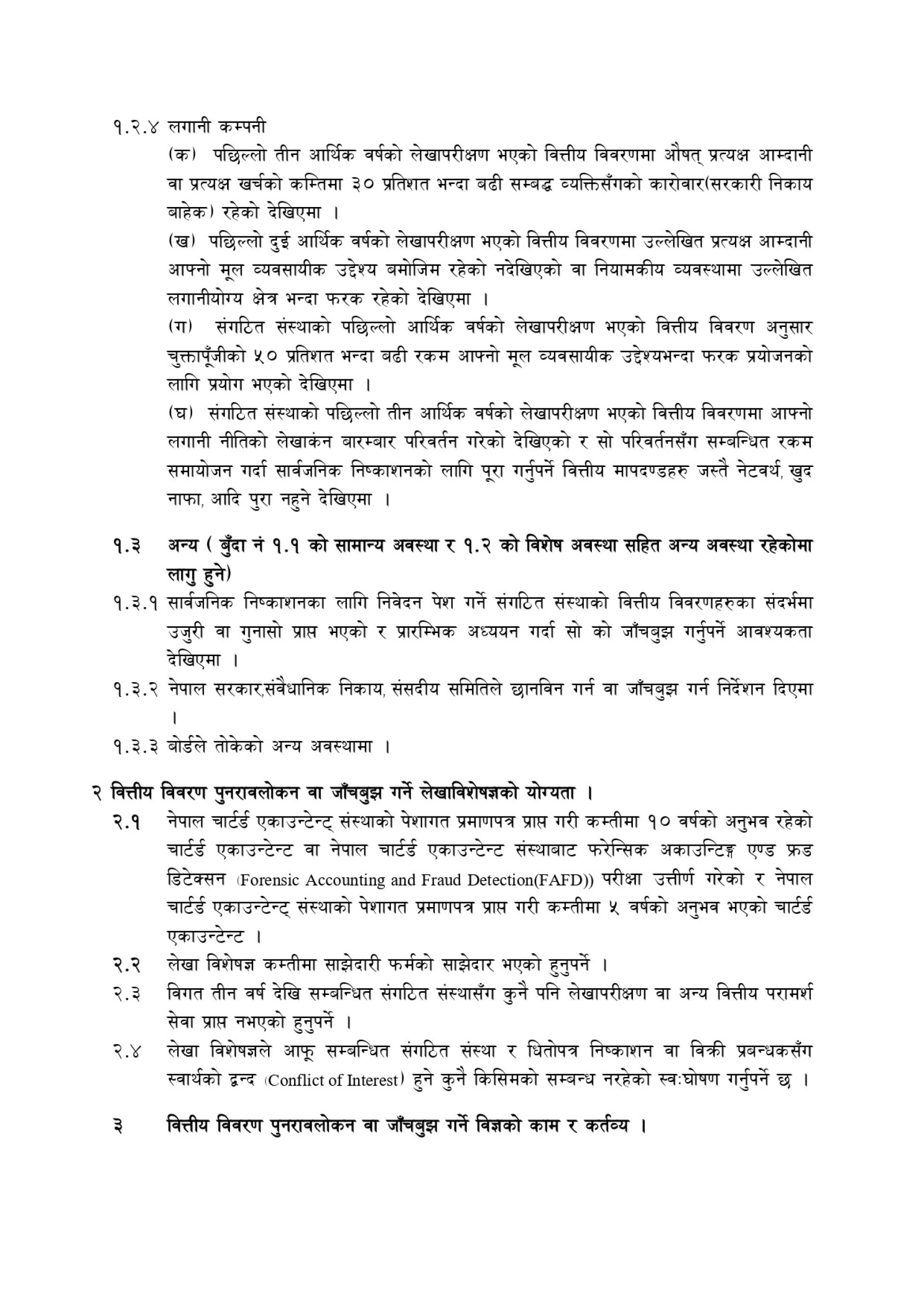 वित्तीय विवरण पुनरावलोकन गर्ने लेखा विशेषज्ञले नेपाल चार्टर्ड एकाउन्टेन्ट संस्थाबाट प्रमाणपत्र प्राप्त चार्टर्ड एकाउन्टेन्ट हुनुपर्नेछ भने कम्तीमा १० वर्षको अनुभव प्राप्त गरेको हुनुपर्नेछ । फरेन्सिक अकाउन्टिङ्ग र फ्रड डिटेक्सनमा प्रशिक्षण प्राप्त ५ वर्ष अनुभव भएको चार्टर्ड एकाउन्टेन्ट पनि योग्य मानिनेछ।