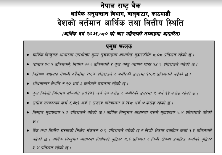 आयात प्रतिबन्ध कायम रहँदा विदेशी मुद्रा सञ्चितीमा सुधार आउनुका साथै शोधानान्तर अवस्थामा थप सुधार आएको राष्ट्र बैंकले सार्वजनिक गरेको आर्थिक तथा वित्तीय अवस्थाले देखाएको छ । यस्तै वार्षिक बिन्दुगत आधारमा निक्षेपको वृद्धिदर ८.६ र निजी क्षेत्रमा प्रवाहित कर्जाको वृद्धिदर ५.४ प्रतिशत छ । आयातमा भएको प्रतिबन्धले गर्दा कर्जा प्रवाह खुम्चिएको छ ।