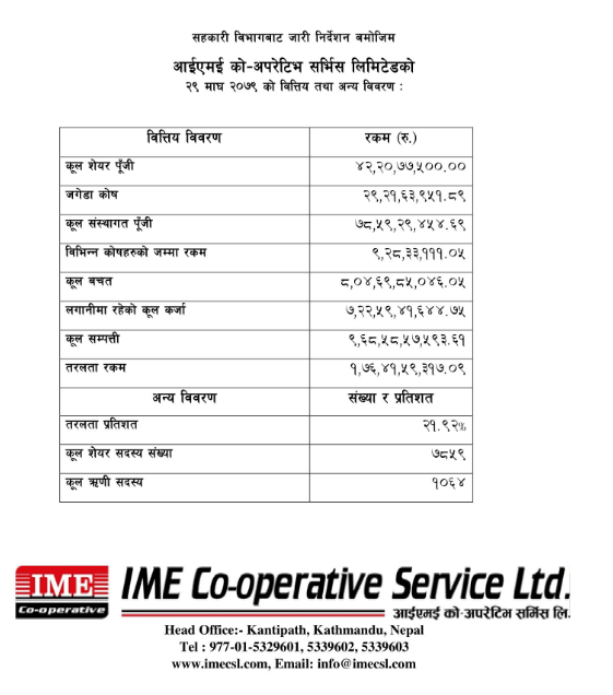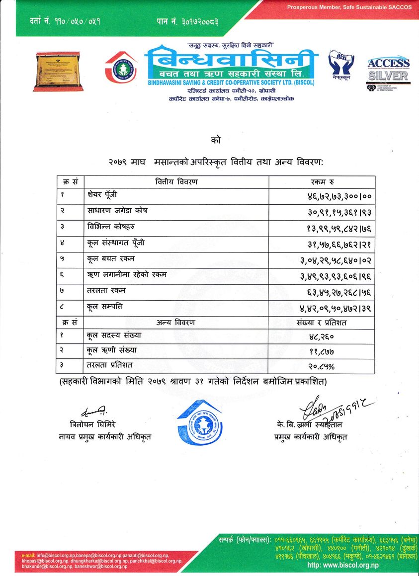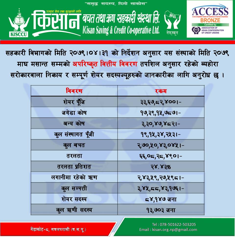 संस्थाले प्रकाशित गरेको माघ महिनाको अपरिष्कृत वित्तीय विवरण अनुसार संस्थाको सेयर पुँजी २१ करोड ६ लाख, जगेडा कोषमा १५ करोड ७३ लाख, विभिन्न कोषहरुमा ११ करोड ९८ लाख रुपैयाँ, कुल संस्थागत पुँजी १५ करोड ८८ लाख रुपैयाँ, बचत संकलन १ अर्ब ६७ करोड ७७ लाख, ऋण लगानी १ अर्ब ७८ करोड रुपैयाँ र कुल सम्पत्ती २ अर्ब २८ करोड ३२ लाख रुपैयाँ रहेको विवरणमा उल्लेख छ ।
