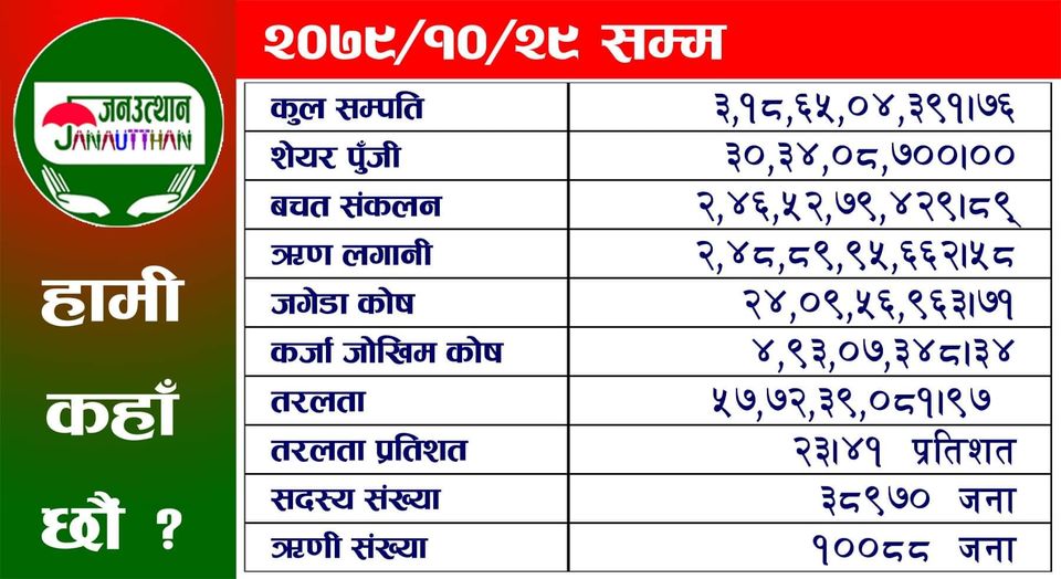 रुपन्देहीस्थित जनउत्थान बचत तथा ऋण सहकारी संस्थामा माघ मसान्तमा २३.४१ प्रतिशत अर्थात ५७ करोड ७२ लाख रपैयाँ तरलता छ । संस्थाले प्रकाशित गरेको अपरिष्कृत मासिक वित्तीय विवरण अनुसार २ अर्ब ४६ करोड ५२ लाख बचत संकलन र २ अर्ब ४८ करोड ५९ लाख रुपैयाँ ऋण प्रवाह गरेको छ ।