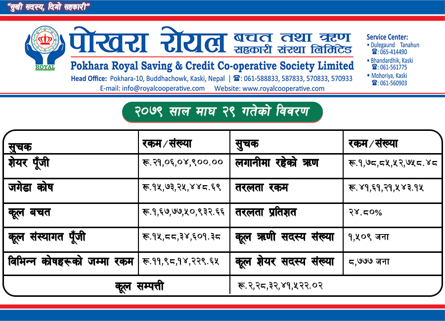कास्कीस्थित पोखरा रोयल बचत तथा ऋण सहकारी संस्थामा पुष मसान्तमा तरलता रकम ४१ करोड ६१ लाख ९४ हजार रुपैयाँ अर्थात २४.८० प्रतिशत तरलता रहेको छ ।