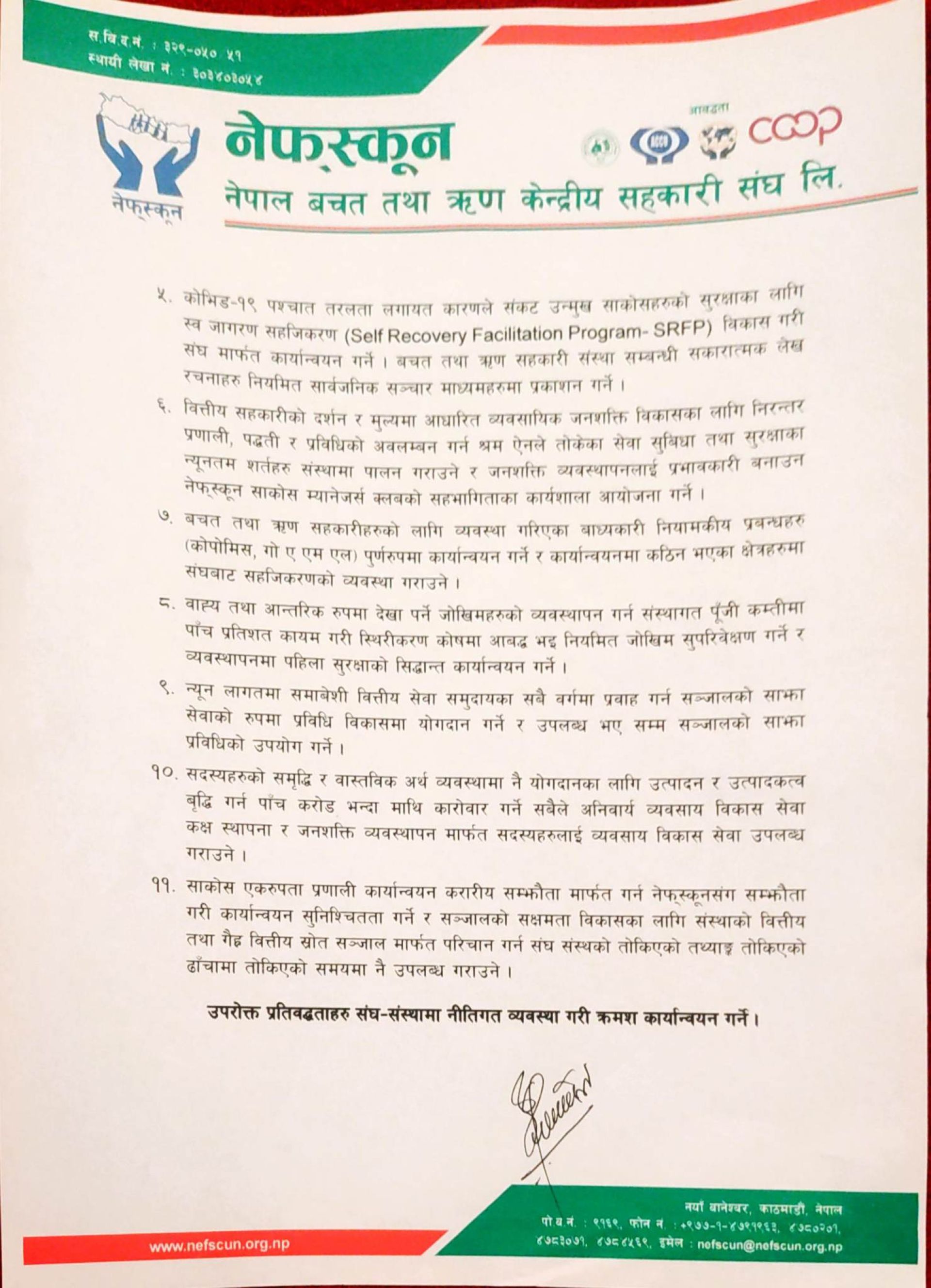 त्यस्तै बाध्यकारी नियामकीय प्रबन्धहरु पुर्णरुपमा कार्यान्वयन गर्ने समेत प्रतिवद्धता जनाएका छन् । जोखिमहरुको व्यवस्थापन गर्न संस्थागत पूँजी कम्तीमा पाँच प्रतिशत कायम गरी स्थिरीकरण कोषमा आबद्ध हुने समेत उनीहरुले प्रतिवद्धता जनाएका छन् ।