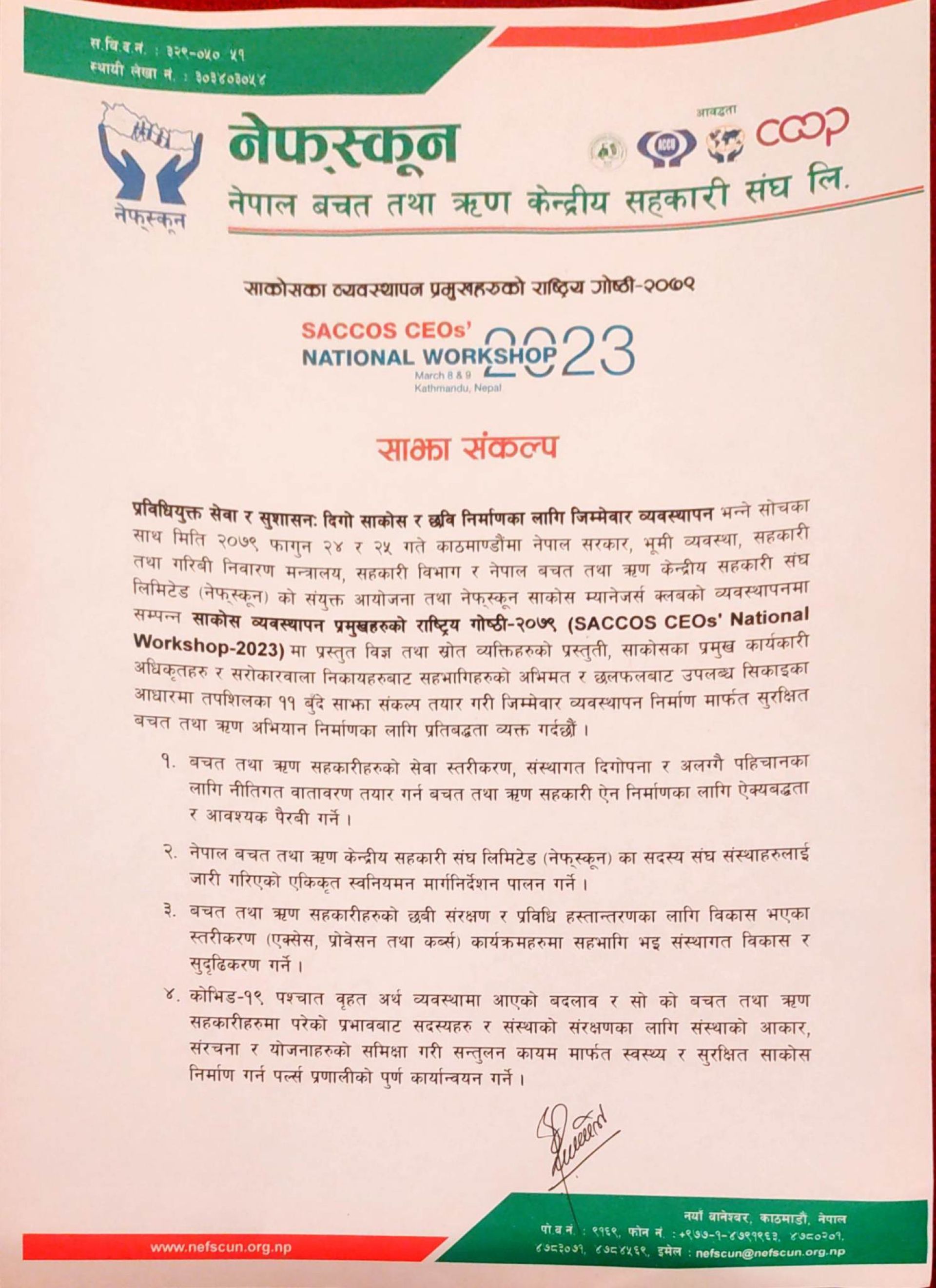 काठमाडौं : नेपाल बचत तथा ऋण केन्द्रीय सहकारी संघ (नेफ्स्कून)ले आयोजना गरेको व्यवस्थापन प्रमुखहरुको राष्ट्रिय गोष्ठी (सिईओ वर्कशप) ११ बुँदे साझा संकल्प जारी गर्दै बिहीबार सम्पन्न भएको छ।