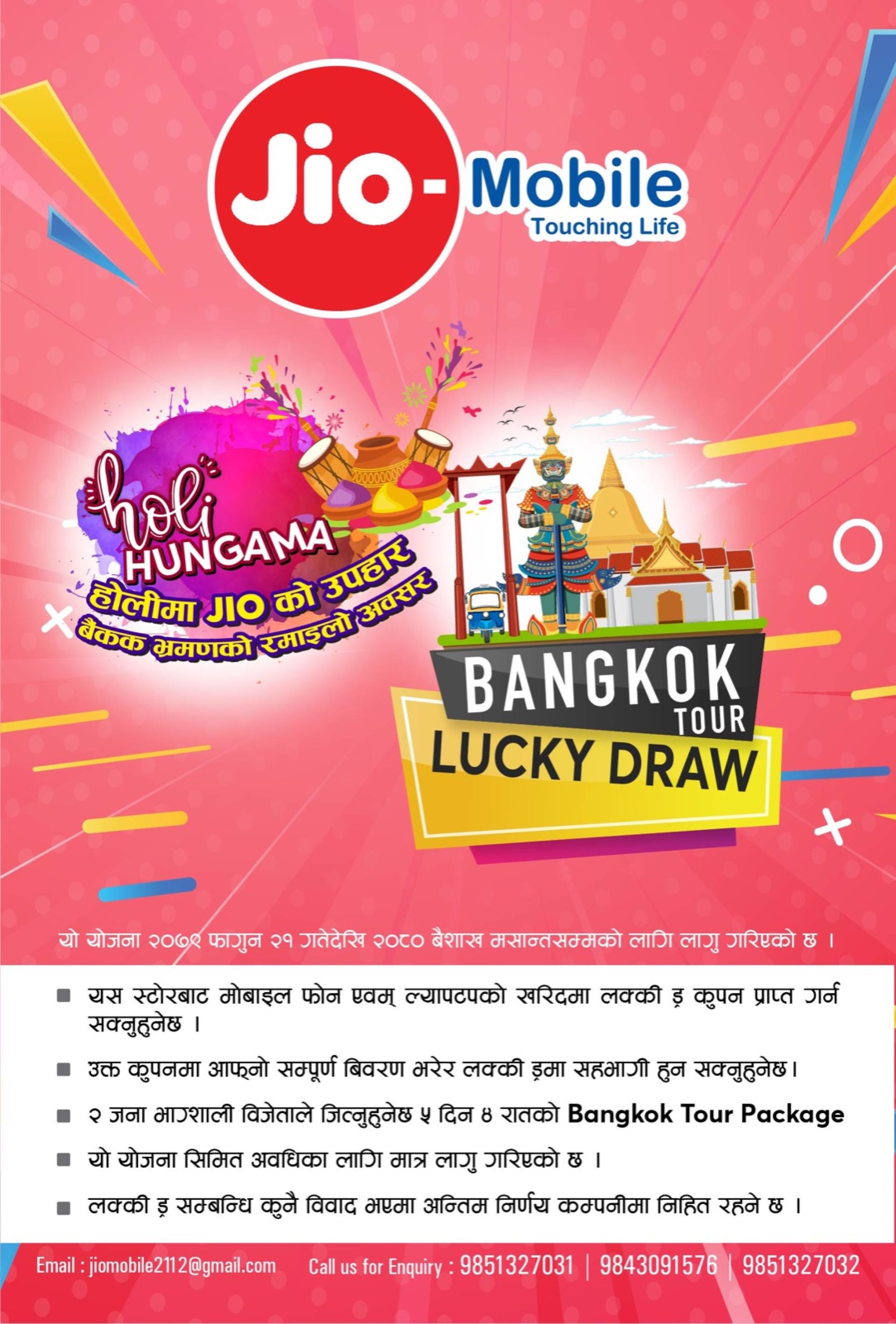 न्युरोड ताम्राकार कम्प्लेक्सको तेस्रो तला (शप नं. ३१) मा रहेको जिओ स्टोरले फागुन २१ गतेदेखि ‘होलीमा जिओको उपहार, बैंकक भ्रमणको रमाईलो अवसर’ अफर ल्याएको हो। यो अफर बैशाख मसान्तसम्म रहने स्टोरले जनाएको छ।
