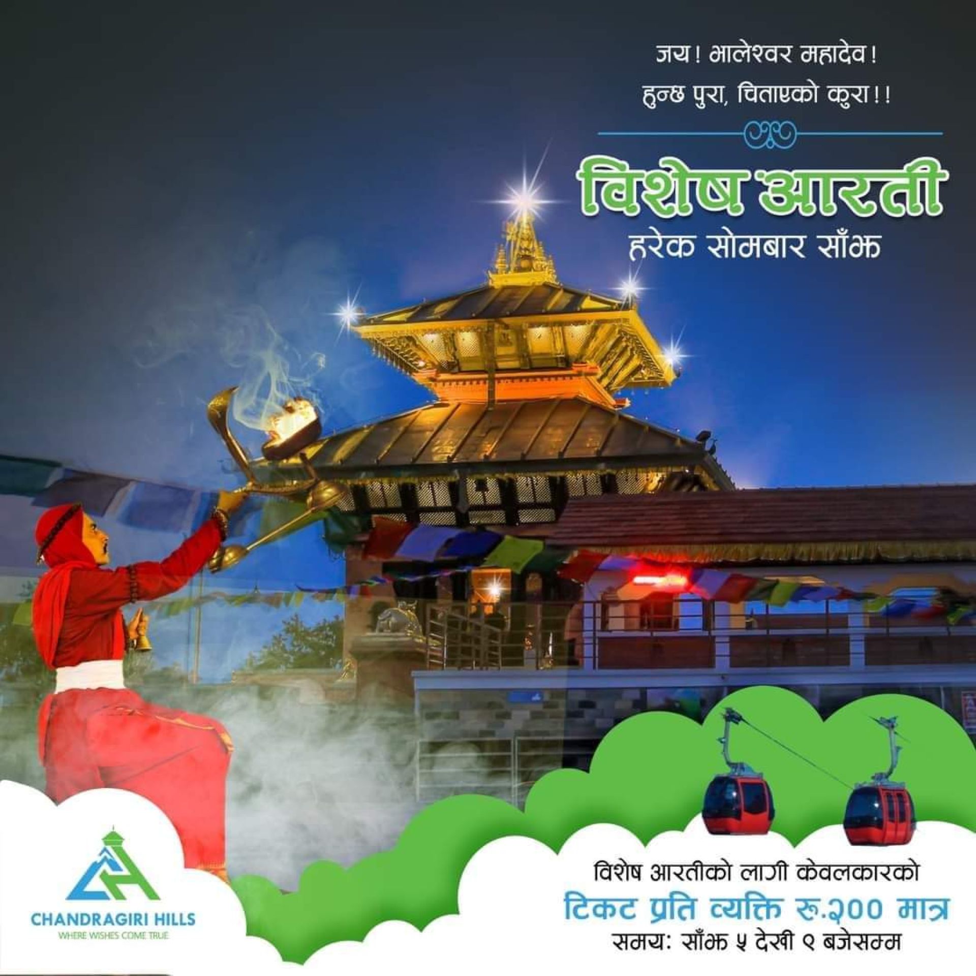 साउनको हरेक सोमबार साँझ चन्द्रागिरि हिल्स मन्दिर व्यवस्थापन समितिले यसैगरी भालेश्वर महादेवमा पूजाआजाका साथै साँझ विशेष सन्ध्या आरतीको आयोजना गर्ने चन्द्रागिरि हिल्स लिमिटेडका महाप्रबन्धक सन्जिब थापाले बताए ।