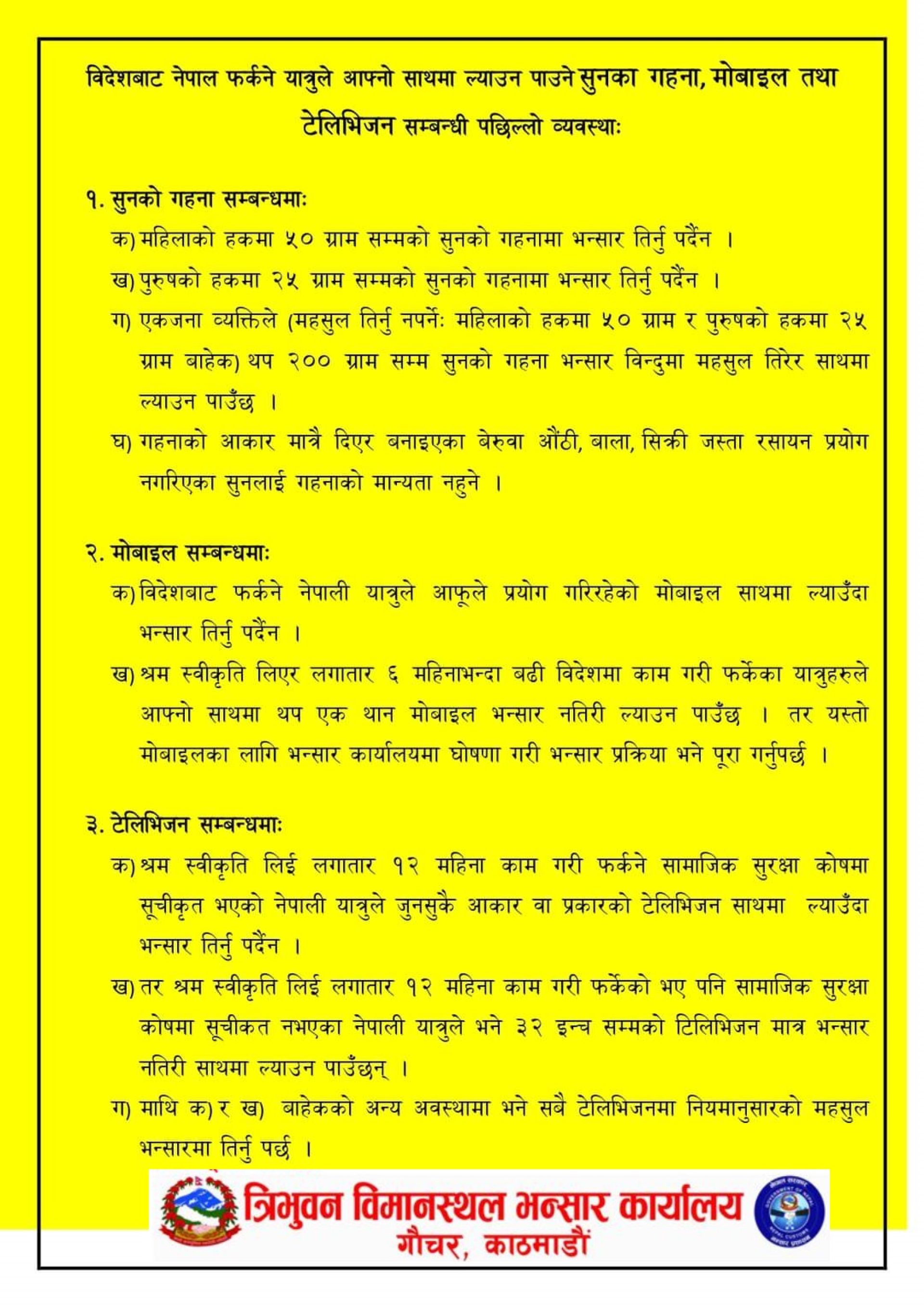 कार्यालयका अनुसार श्रम स्वीकृति लिई लगातार १२ महिना काम गरी फर्केको भए पनि सामाजिक सुरक्षा कोषमा सूचीकृत नभएका नेपाली यात्रुले भने ३२ इन्च सम्मको टिलिभिजन मात्र भन्सार नतिरी साथमा ल्याउन पाउनेछन् । तर, यस यसबाहेक अन्य अवस्थामा भने सबै टेलिभिजनमा नियमानुसारको महसुल भन्सारमा तिर्नु पर्ने व्यवस्था गरेको छ ।