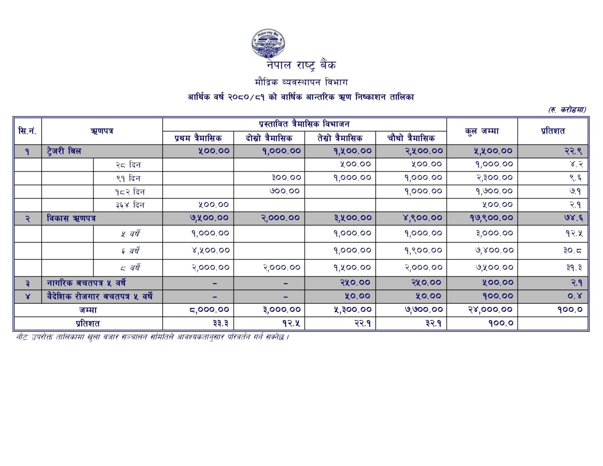 राष्ट्र बैंकले यस अवधिमा २८ दिन अवधिको १० अर्ब, ९१ दिन अवधिको २३ अर्ब, १८२ दिन अवधिको १७ अर्ब र ३६४ दिन अवधिको ५ अर्ब रुपैयाँ बराबरको ट्रेजरी बिल जारी गर्ने छ ।