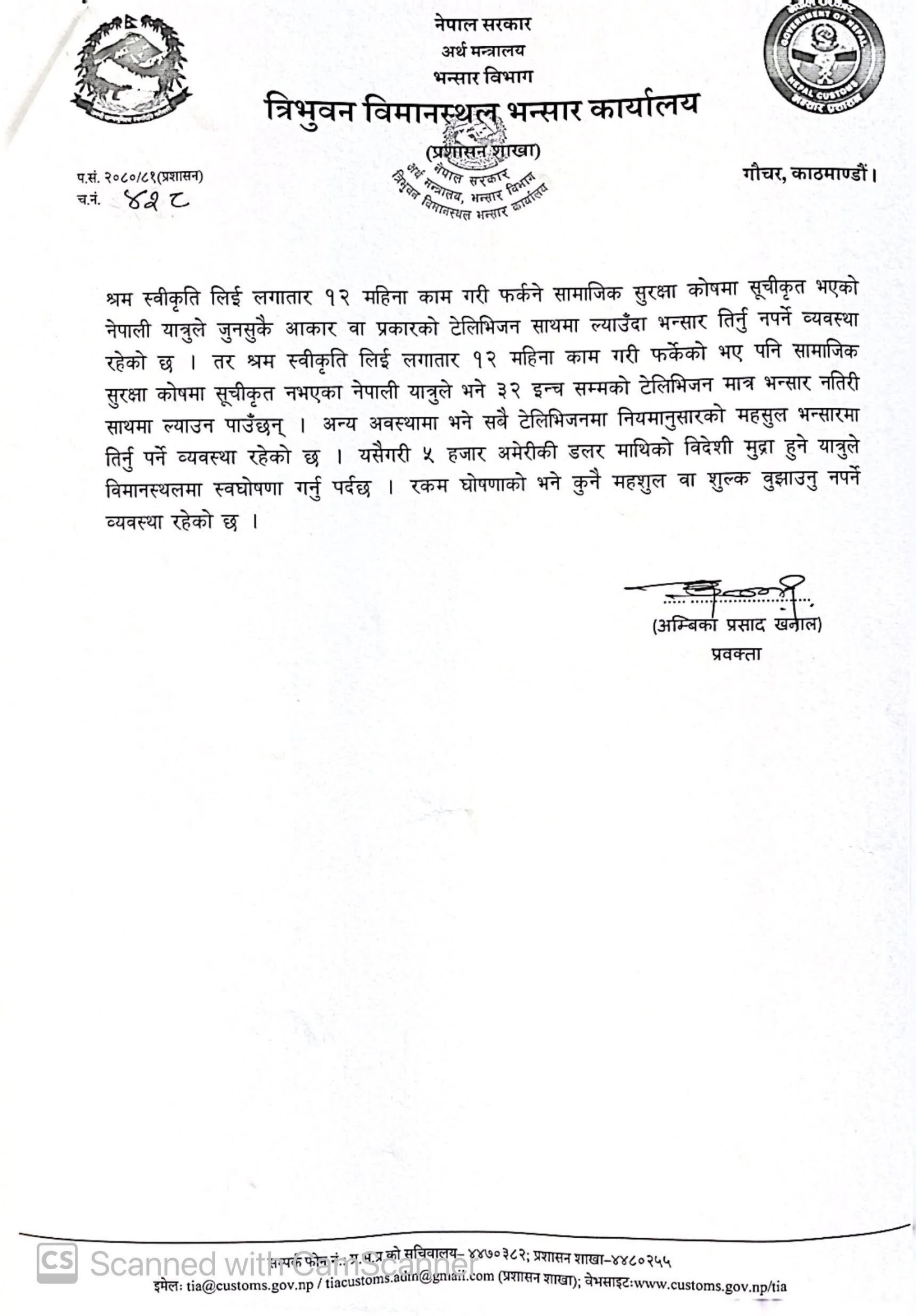 टेलिभिजनको हकमा श्रम स्वीकृति लिई लगातार १२ महिना काम गरेको र सामाजिक सुरक्षा कोषमा सूचीकृत भएका यात्रुले जुनसुकै आकार वा प्रकारको टेलिभिजन भन्सार नतिरी ल्याउन पाउने व्यवस्था छ । तर श्रम स्वीकृति लिई लगातार १२ महिना काम गरी फर्केको भए पनि सामाजिक सुरक्षा कोषमा सूचीकृत नभएका नेपाली यात्रुले भने ३२ इन्च सम्मको टेलिभिजन मात्र भन्सार नतिरी ल्याउन पाउँछन् । अन्य अवस्थामा भने सबै टेलिभिजनमा नियमानुसारको महसुल भन्सारमा तिर्नु पर्ने व्यवस्था रहेको छ ।