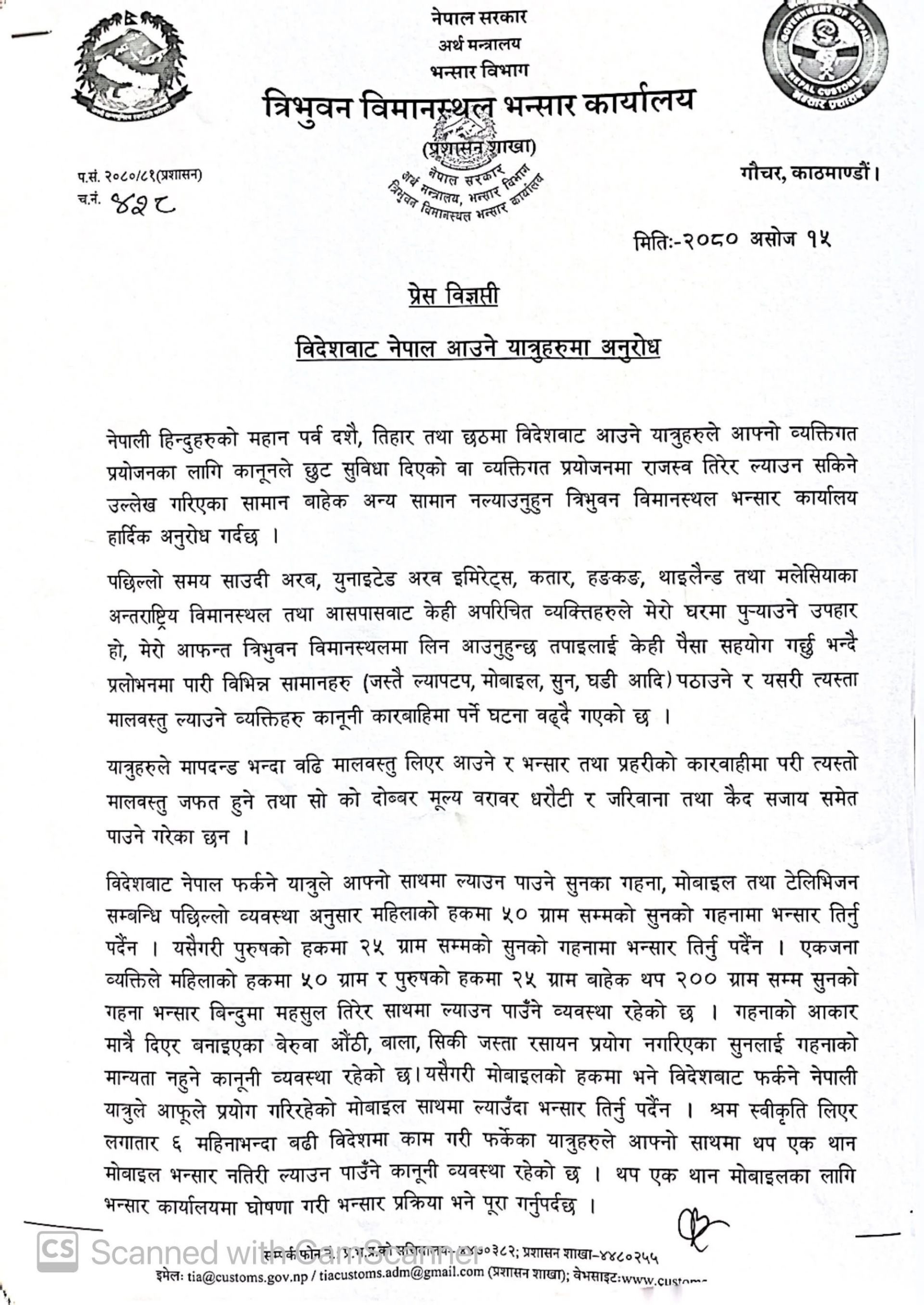 भन्सार कार्यालयका अनुसार विदेशबाट नेपाल फर्कने यात्रुले काननुले छुट दिएको वा व्यक्तिगत प्रयोजनका लागि राजस्व तिरेर ल्याउन सकिने उल्लेख गरेका सामान बाहेक अरु सामान ल्याउन पाइने छैन ।