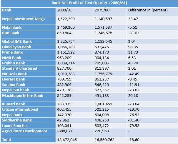 पहिलो त्रैमाससम्म आइपुग्दा एघार बैंकको नाफा घटेको छ भने नौं वटा बैंकहरुको नाफा बढेको छ । त्यस्तै कृषि विकास बैंक भने नोक्सानीमा रहेको छ । अधिकांश बैंकहरुको खराब कर्जा बढ्दा बैंकहरुको नाफामा असर परेको हो ।
