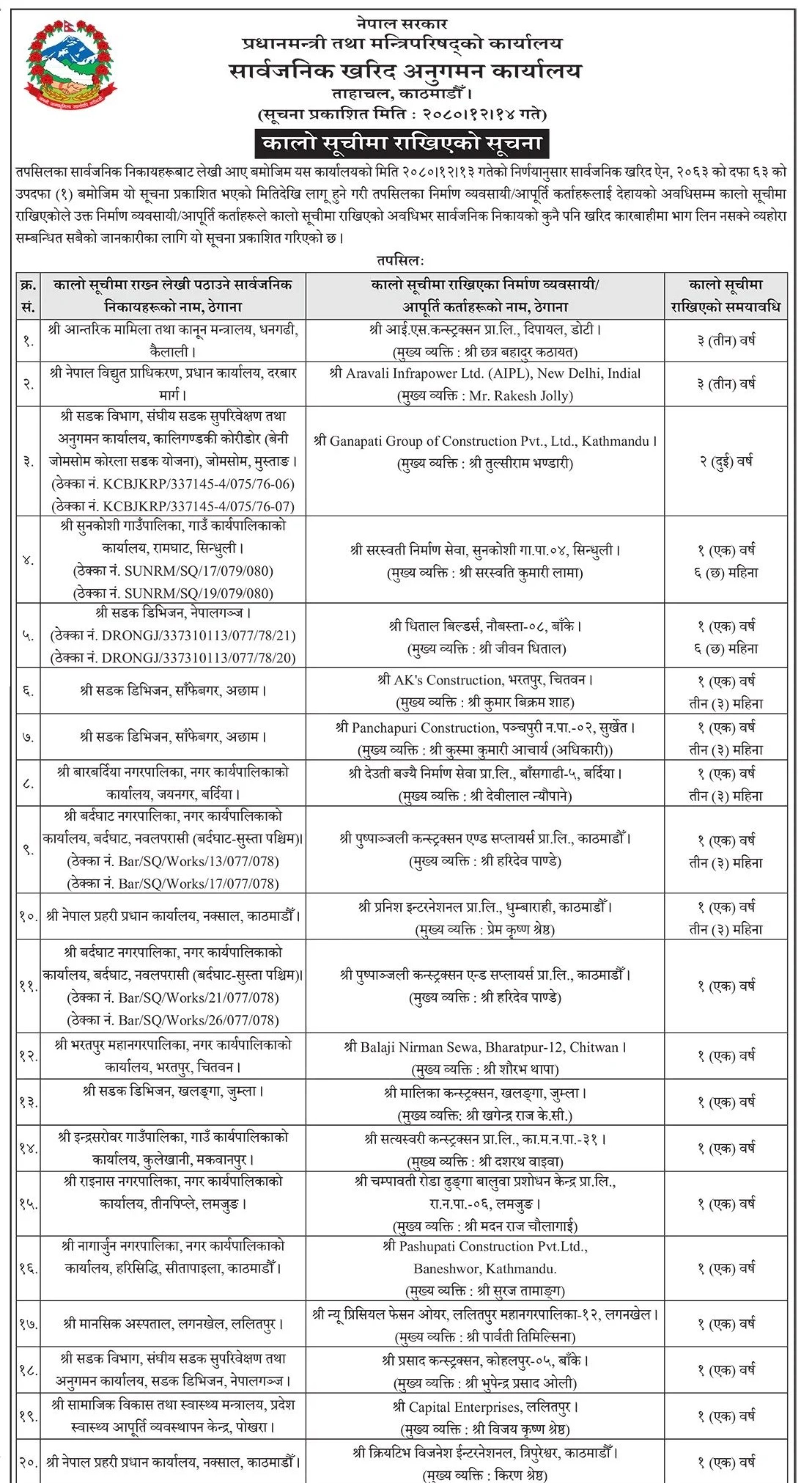 उक्त निर्माण कम्पनी तथा व्यवसायीलाई ठेक्का लिएर समयमा काम नगरेको भन्दै एक वर्षदेखि तीनवर्षसम्मको लागि कालोसूचीमा राखिएको कार्यालयले जनाएको छ ।
