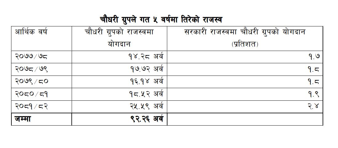 योसँगै गत पाँच वर्षमा चौधरी ग्रुपले सरकारलाई ९२ अर्ब २६ करोड रुपैयाँ कर तिरेको छ। कमजोर आर्थिक गतिविधि, आयात-निर्भर बजार, नीतिगत अस्थिरता तथा निजी लगानीमा आएका बाधाका बाबजुद पनि चौधरी ग्रुपले निरन्तर करमा वृद्धि गर्दै आएको छ। यसले राष्ट्रका विकास योजनाहरू, सामाजिक सुरक्षा, पूर्वाधार निर्माण तथा सार्वजनिक सेवाका क्षेत्रमा राज्यलाई थप आधार प्रदान गर्ने चौधरी ग्रुपले विश्वास लिएको छ।